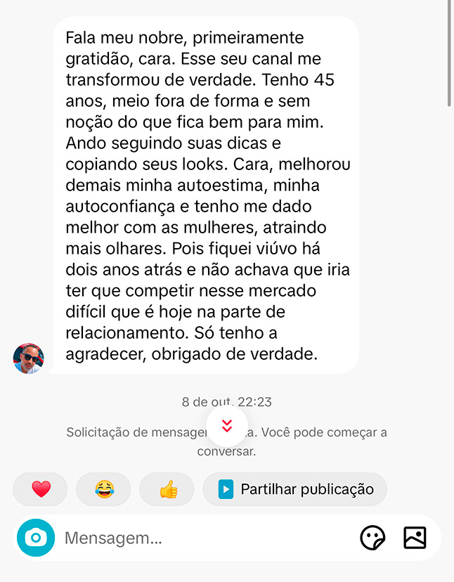 Minha missão é ajudar homens a alcançarem sua melhor versão. Acredito que o estilo certo transforma não apenas sua aparência, mas também sua confiança e a forma como você é percebido. Com este e-book, você terá um guia prático, direto e fácil de aplicar para transformar sua rotina e sua imagem de forma definitiva.
